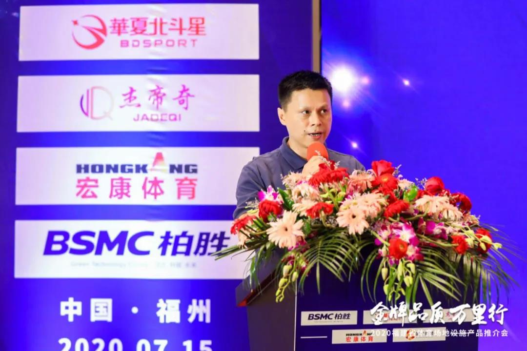 與會上,特邀嘉賓福建省體育設施行業協會會長陳程先生首先致辭,客觀分析2020年是不平凡的一年,后疫情時代下體育產業里各個公司都面臨著嚴峻的考驗與挑戰,但更是機遇,而則延續中國品牌日精神,打造自主中國品牌,助力福建體育產業建設與體育文化建設,努力發揮職能作用,維護會員合法權益,加強行業自律管理,引導行業公平競爭,促進體育設施場地建設行業健康發展。