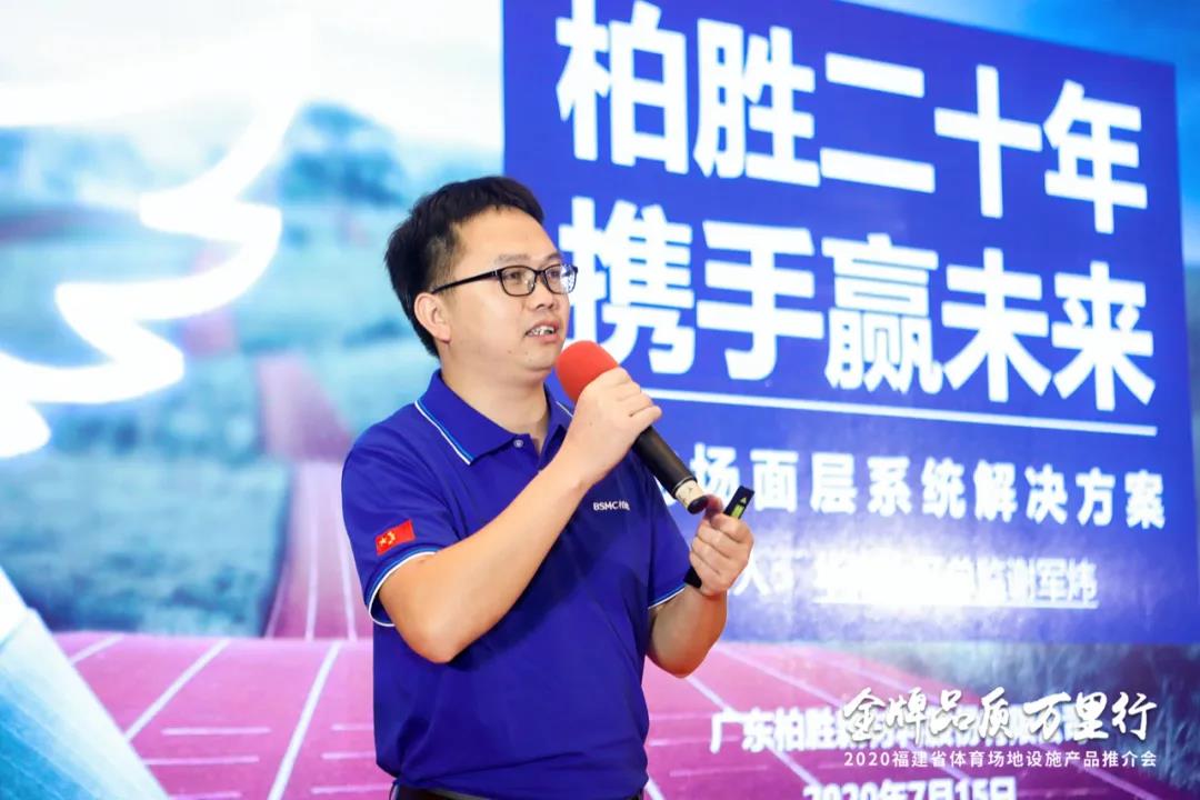 會議上,四家主辦單位企業先后對該公司的產品做了詳細推介演講,其中,BSMC柏勝華南大區總監謝軍煒先生在與會作了《柏勝硅PU跑道及球場運動場面層系統解決方案》產品推介。作為行業首家引進iAUTO智造的生產型廠家,柏勝業務遍布全球80多個國家和地區,產品應用面積逾2800萬㎡。柏勝科研團隊不斷突破新科技,2011年柏勝硅PU跑道誕生,至今日趨成熟,在未來,硅pu跑道必將引領塑膠行業原料新變革。柏勝硅PU跑道可滿足全天候的跑道及運動場場地需求,通過世界田徑認證,具備最佳運動性能與環保性,是解決未來運動場鋪設的極優選擇,其中與悅跑圈戰略合作的智能跑道項目,在最后閃亮登場,引起了福建體育設施建設行業工程商、體育場館業主和教育機構極大興趣。