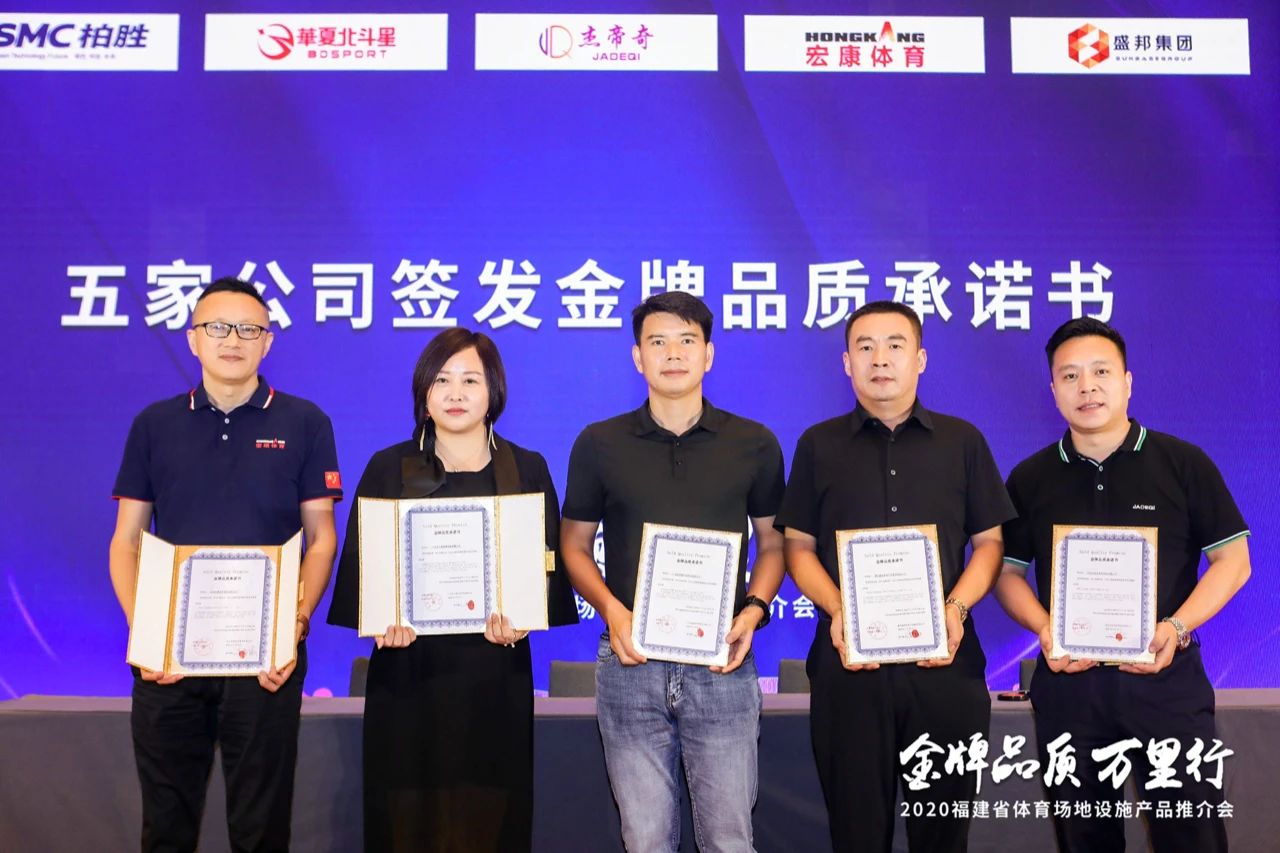 隨后, 在全場嘉賓的注視下,五家主辦單位公司領導人一同上臺簽署《品質承諾書》,以實際行動宣布:竭力捍衛品牌品質、品牌榮譽,堅守質量的底線決不動搖!向福建體育設施建設行業保證保質,等于立下軍令狀,決心為福建省體育場地設施基礎建設貢獻一份力量。