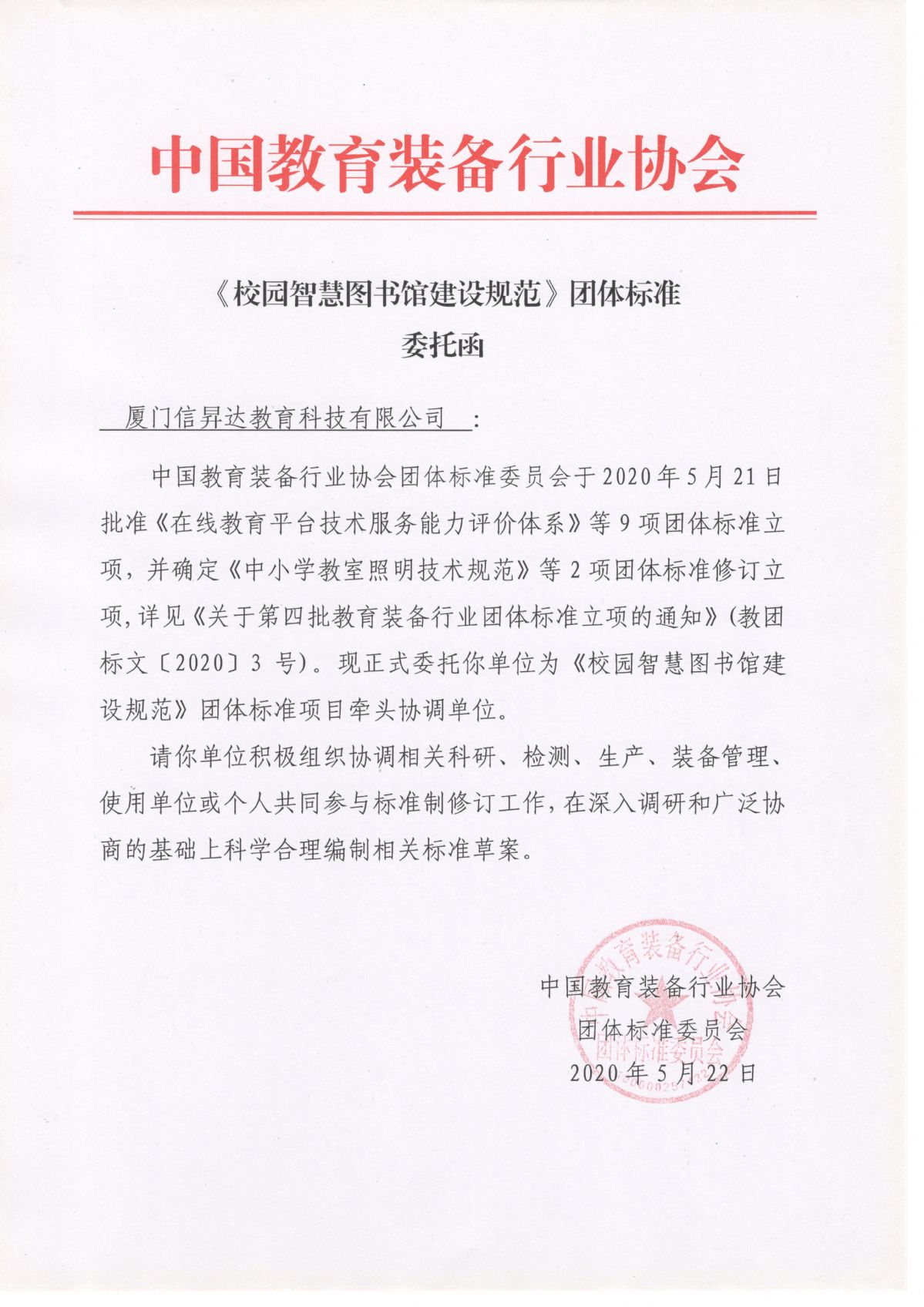 受中國教育裝備行業協會委托,由信昇達作為《校園智慧圖書館建設規范》標準項目牽頭協調單位,負責立項標準草案編制工作。為確保標準編制水平和編制進度,現公開向社會各界有關生產企業、科研單位、檢測機構、教育廳、教育局、文化局、教育裝備部門、中小學圖書館館長、高等院校征集參編單位,望各有關單位積極參加,共同助推校園智慧圖書館建設取得新成就!