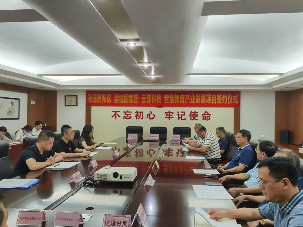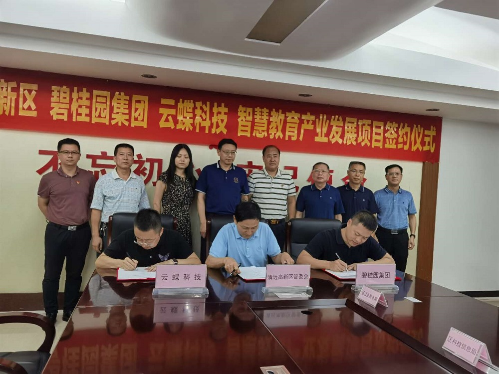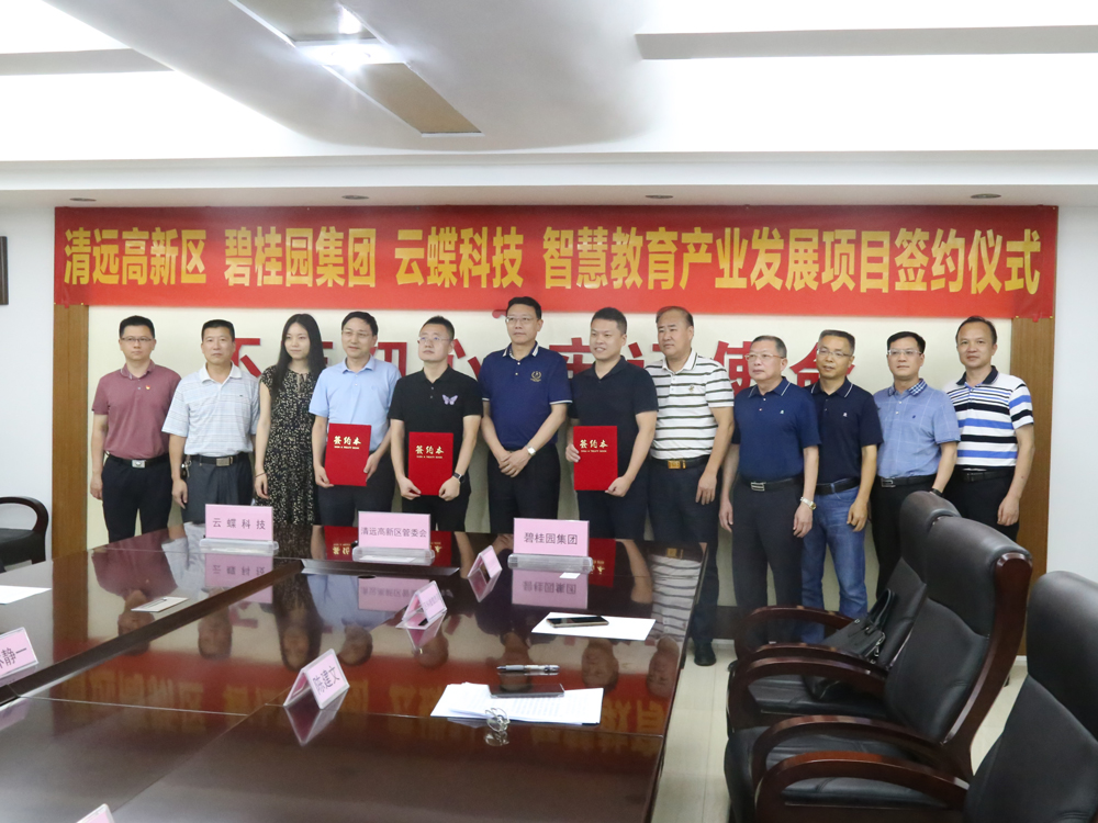 7月22日,清遠國家高新區與碧桂園控股有限公司、廣州云蝶科技有限公司舉行了智慧教育產業發展項目簽約儀式。按照協議,三方將共同推進智慧教育科技產業落地高新區蓮湖片區,并著力將其打造成為國家級的智慧教育產業園。