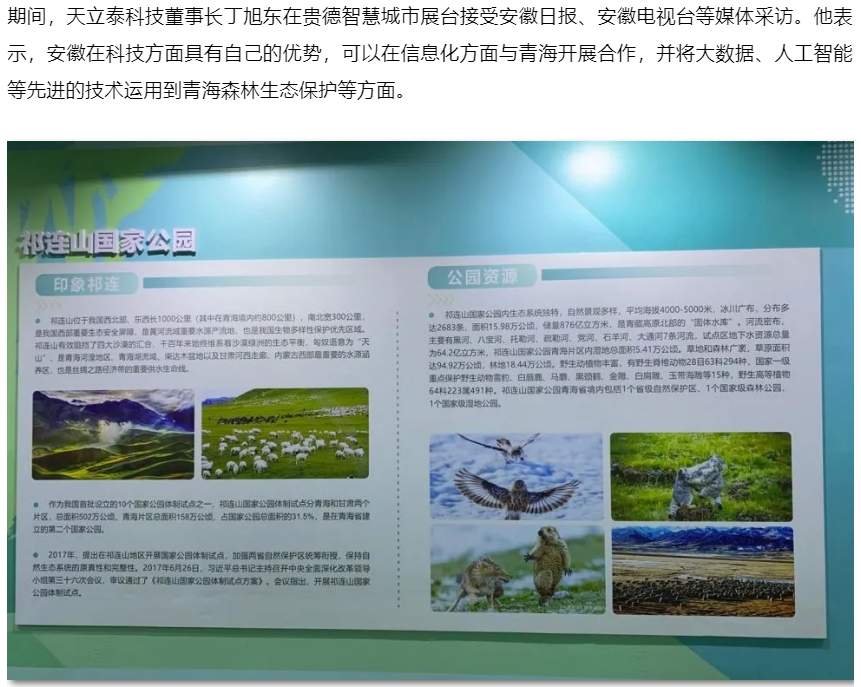 目前青海正在建設國家公園示范省,森林保護是其中一項重要內容,天立泰公司運用科技信息手段,在祁連山國家公園建立林業大數據庫,助力環保。天立泰致力于面向自然空間的生態監測、生態管護、生態價值評估等信息化應用領域的機遇與挑戰,通過建設基于國家公園生態監測的大數據平臺,積極開展森林、荒漠、冰川雪山、河流沼澤、野生動物識別等生態系統及生物多樣性科研監測,實現森林生態資源“一張圖”對于國家公園信息應用管理的支撐服務。