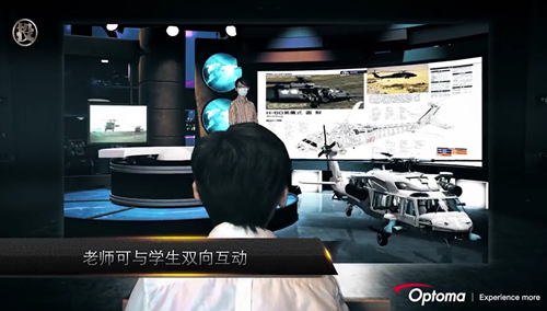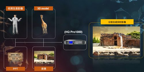 在使用這套系統時,教師一個人就能完成授課過程:教師在綠幕棚進行錄像,影像將會被傳輸到奧圖碼HQ Pro 1000影音處理器中,處理器會將課程需要的的背景畫面、PPT簡報、3D畫面甚至AR影像與教師講課的身影融合,呈現出更加的沉浸的教學效果,然后實時將畫面傳遞到學生的屏幕上。