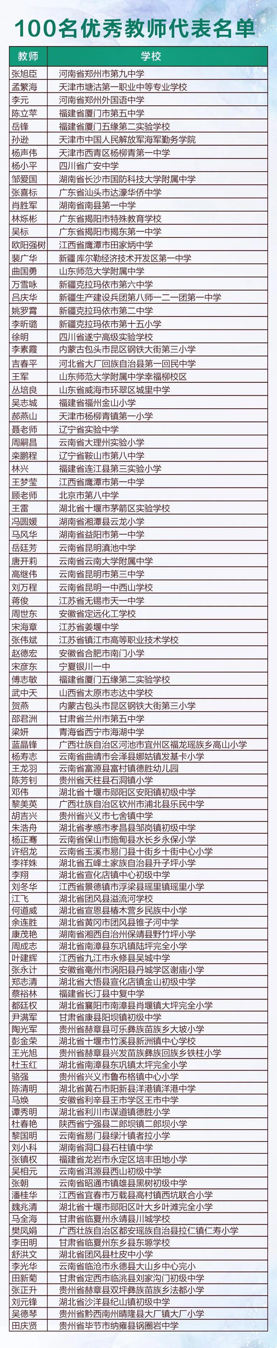 100位健康光環境示范校及“點亮中國偏鄉”項目學校優秀教師代表如下: