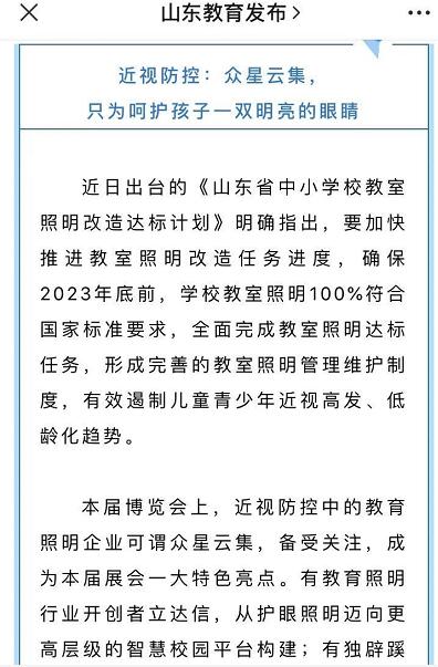 山東省教育廳官方微信展前、展中均對展會進行相關報道,并提及“立達信是教育照明行業開創者,從護眼照明邁向更高層級的智慧校園平臺構建”。