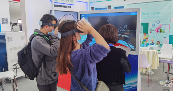 在VR超感學(xué)習(xí)角展區(qū),與會者戴著VR頭盔正在體驗VR科普內(nèi)容,也有體驗者在游覽祖國大好河山。這種操作簡單的體驗方式,無需工作人員指導(dǎo)便可自助式學(xué)習(xí)體驗。不僅得到現(xiàn)場與會者的好評,更是受到諸多學(xué)校師生的喜愛。利用課余時間,學(xué)生們可以自由體驗。同時學(xué)校也可以在VR超感學(xué)習(xí)角上發(fā)布最新的動態(tài)和通知,真正做到一機多用。
