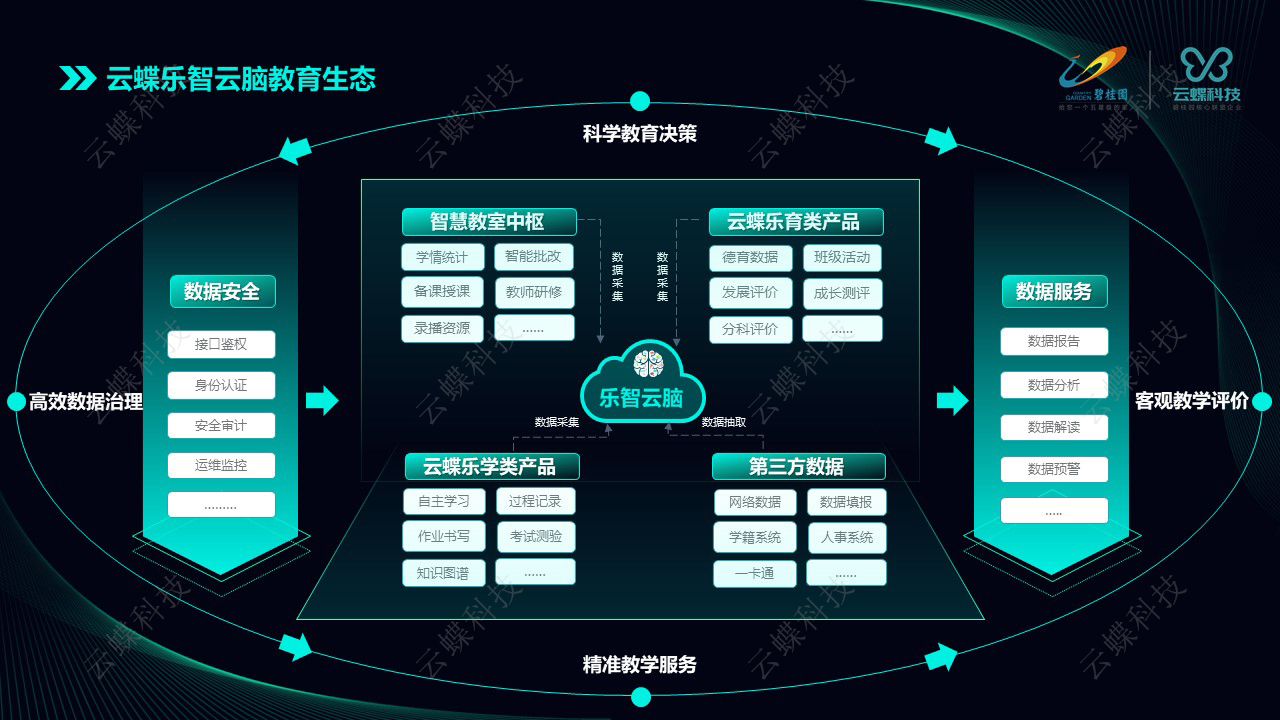云蝶樂智云腦平臺融合了云蝶軟硬件產品的數據,也支持第三方數據的對接,最終經過云腦處理,為用戶提供數據報告、數據分析、數據解讀、數據決策、數據預警等服務,形成以云蝶樂智云腦為中心的教育生態閉環。