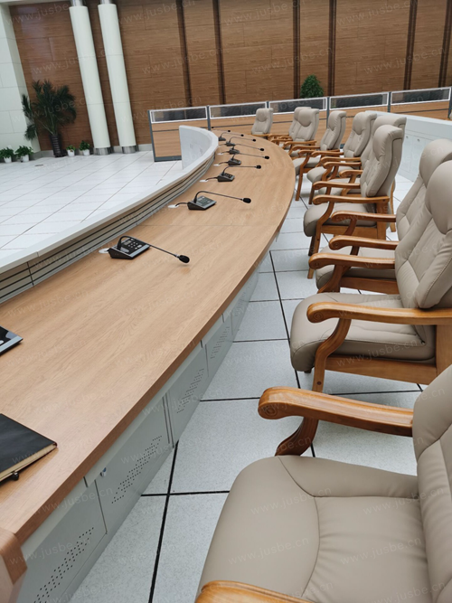 指揮中心主席臺,采用的手拉手會議系統(tǒng),支持討論和視像跟蹤功能,具備多種會議模式選擇。系統(tǒng)可設(shè)置發(fā)言數(shù)量、自動/限時關(guān)閉、聲控發(fā)言等功能。會議系統(tǒng)討論單元采用防干擾電路設(shè)計,超指向電容話筒,實現(xiàn)高品質(zhì)聲音拾取。話筒帶聲頻啟動功能,發(fā)言時話筒單元電源自動打開。其中,主席單元擁有優(yōu)先發(fā)言權(quán)。