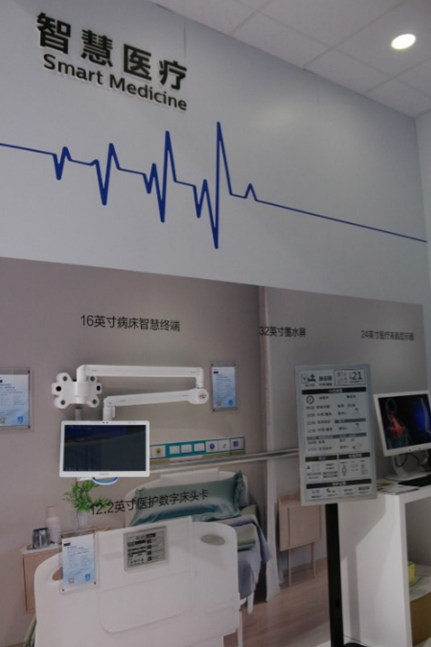 現場飛利浦模擬了智慧病房的搭建,16英寸病床智慧終端搭配12.2英寸醫護數字床頭卡以及32英寸墨水屏,能夠幫助醫生隨時了解患者的病情,而患者及家屬也能夠一目了然了解當天醫護安排,通過屏幕關注自身的身體狀況及照護記錄。