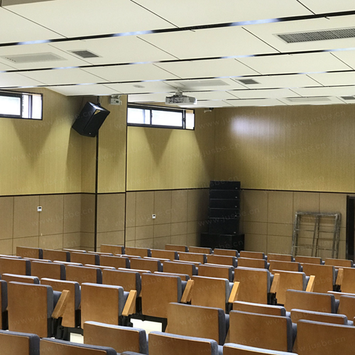 根據需求結合實際場地結構,報告廳擴聲設備采用的JUSBE全頻音箱線陣+次低音音箱+超低頻音箱組合,堆疊式擺放在廳前區左右兩側,精確輻射角度對準整個觀眾區,獲得較強的直達聲,最大程度提供足量的響度。同時在主席臺上配置的4只返聽音箱,保障主席臺上的人員能夠清晰聽到任何擴聲聲音。