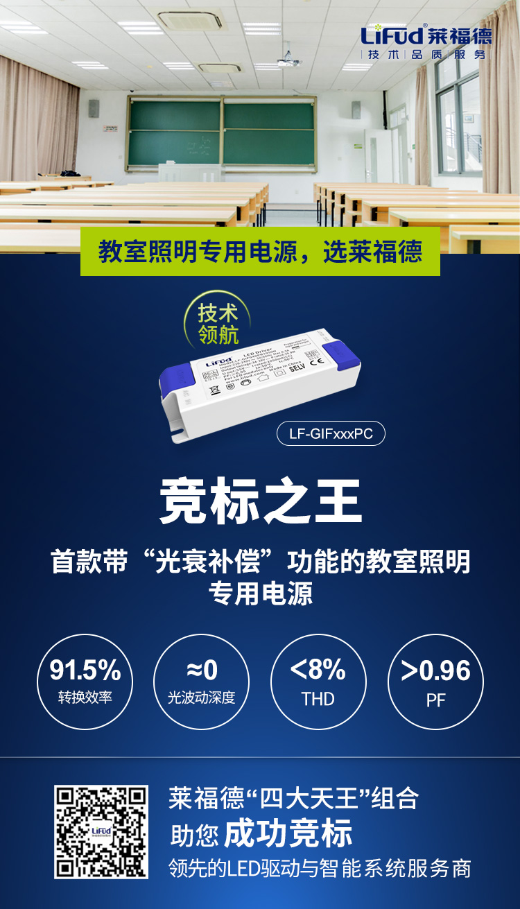 LF-GIFxxxPB作為萊福德專為非智能教室照明改造打造的新品,PB系列擁有極高的轉轉換效率,優異的THD、PF值,是有嚴苛改造要求的教室照明項目首選產品。