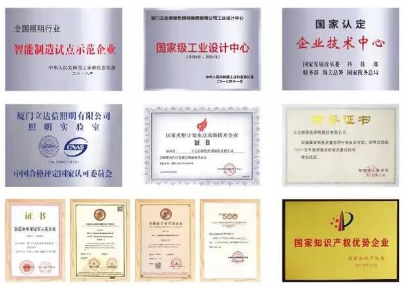 立達信曾榮獲“國家高新技術企業”、“國家技術創新示范企業”、“國家知識產權優勢企業”、“國家智能制造試點示范企業”、“國家半導體照明產業化基地骨干企業”等多項國字號榮譽、資質,承擔并完成了“國家火炬計劃”、“國家重點新產品”等一系列國家級科研項目,也是福建省首家榮獲“福建省政府質量獎”的照明企業。已連續九年獲評“中國照明電器十強企業”,連續八年獲評“中國輕工業百強企業”。