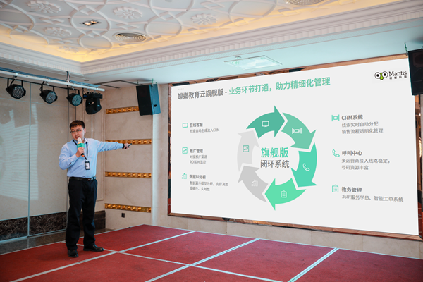 螳螂科技華北大區銷售總監宮汝林也為與會嘉賓詳細介紹了螳螂教育云產品理念。螳螂科技為教育企業提供全方位閉環管理系統,深度融合前端推廣到銷售、網校教務等業務環節,數據打通,提供推廣分析、AI在線客服、智能CRM系統、工作手機、網校教務、全業務數據BI分析等產品形成閉環解決方案,真正從推廣、銷售到教務、網校全鏈條打通形成閉環服務,幫助客戶實現倍速增長,高效管理。