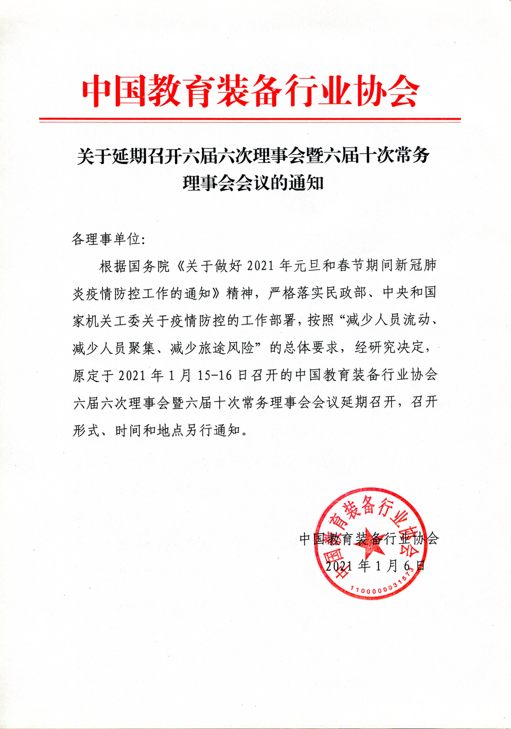 中國教育裝備行業(yè)協(xié)會關(guān)于延期召開六屆六次理事會暨六屆十次常務(wù)理事會會議的通知
