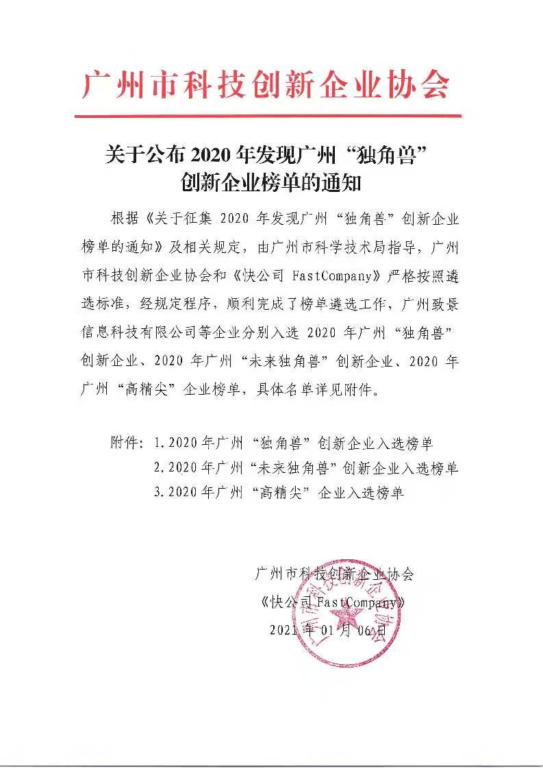 1月6日,由廣州市科學技術局指導,廣州市科技創(chuàng)新企業(yè)協會、《快公司Fast Company》聯合發(fā)布的《2020發(fā)現廣州“獨角獸”創(chuàng)新企業(yè)榜單》完成公示并正式公布。云蝶科技憑借在教育科技領域的創(chuàng)新優(yōu)勢與發(fā)展勢頭,榮獲2020年廣州“未來獨角獸” 創(chuàng)新企業(yè)稱號。