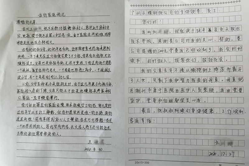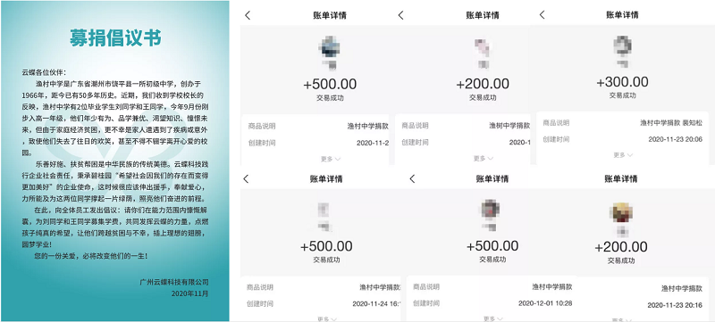 在得知這一情況后,云蝶主動承諾每年向兩位學生捐助學費,以幫助他們順利完成學業。云蝶科技的同事們也紛紛伸出援手,在公司內部發起捐款行動,踴躍奉獻愛心。