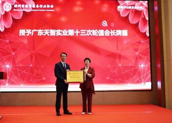會上,深圳市教育裝備行業協會會長彭錦環為天智董事長李美英女士授予輪值會長,并頒發榮譽牌匾。