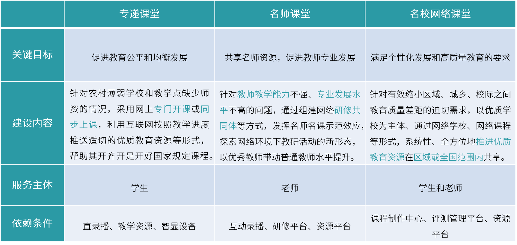 “三個課堂”中關于目標和建設內容具有清晰的界定。“專遞課堂”強調專門性,幫助教育薄弱地區,把基礎課程開齊、開足、開好;“名師課堂”強調共享性,優秀教師帶動普通教師,提升教學能力;“名師網絡課堂”強調開放性,促進優質資源在各區域間共享。