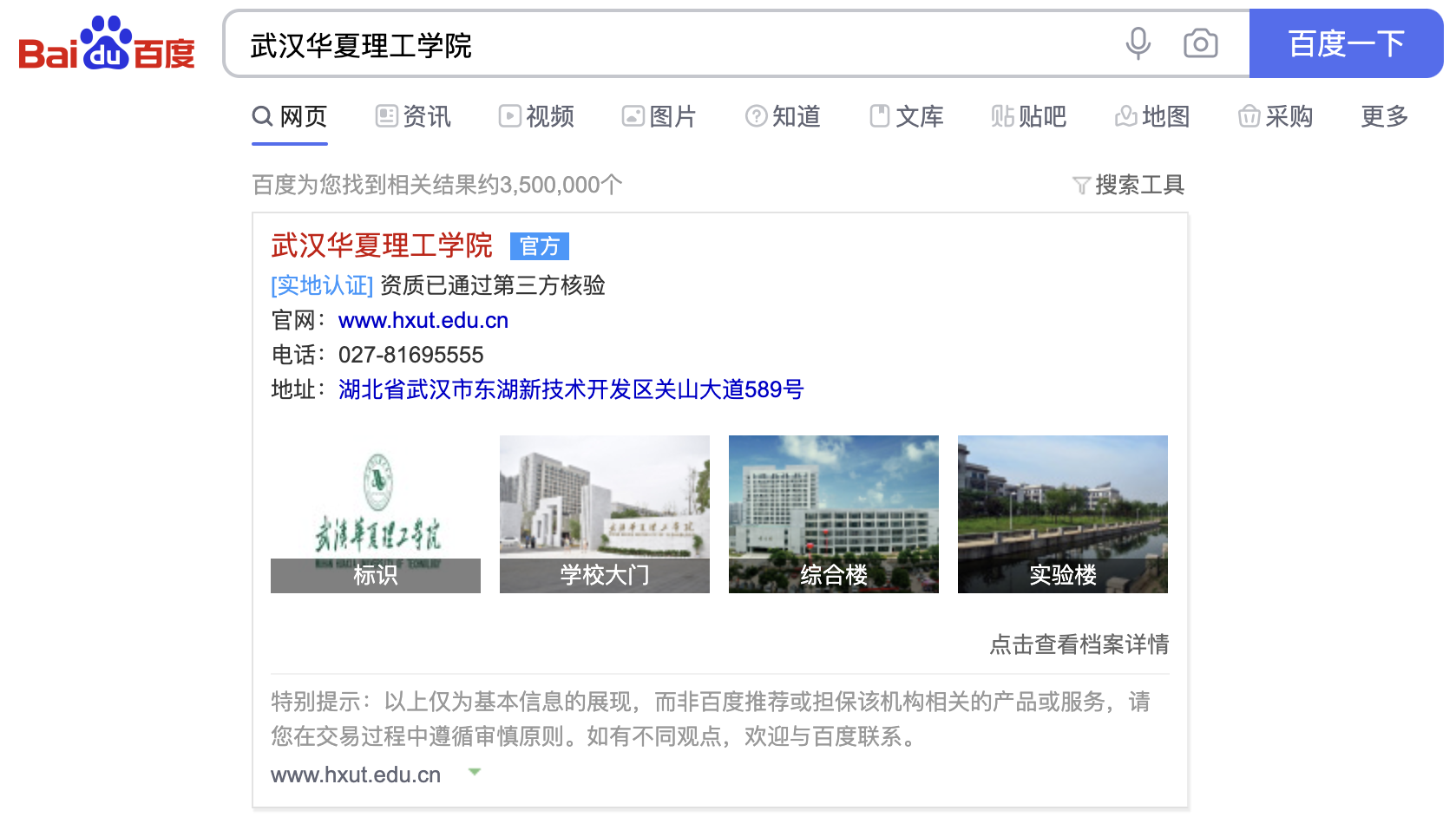 除了線下針對就業指導開展一系列活動以外,武漢華夏理工學院還通過多元的外宣手段提高學校的公信力,以幫助提升和鞏固本校畢業生在外求職時的競爭力。武漢華夏理工學院與百度信譽和武漢空格達成了長期的緊密合作,通過武漢空格做了百度認證服務和展示,給學生、家長以及對學校關注的網友提供了真實有效的認證信息,讓學校優質的師資力量、場地優勢、校園環境等通過客觀的第三方認證和百度的大搜索平臺展示到大眾面前。