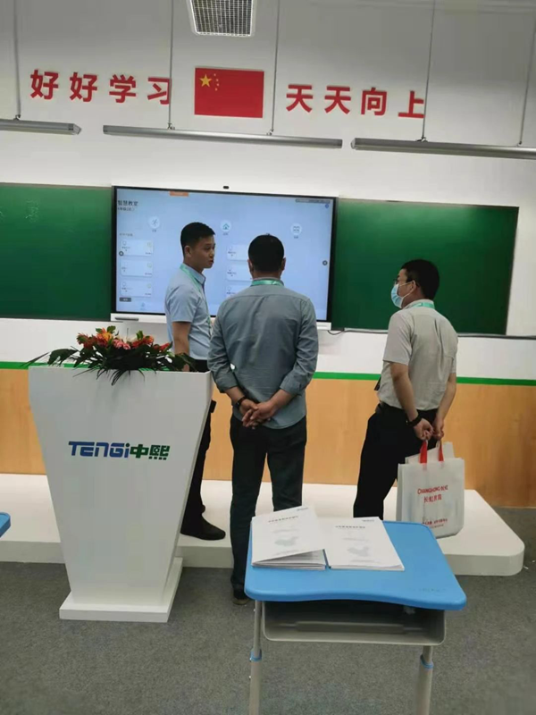 中熙教室護眼燈滿足國標并優于國標,具有亮度高達500Lux以上、無頻閃、無藍光危害RG0、顯示高達95以上、炫光值16以內、節能50%以上、壽命長達50000小時等特點。此次模擬教室1:1全景展示一體化智慧教室的整體效果,通過智能控制將一體機、教室燈光、電動窗簾等設施完美結合,教室照明的6檔智能控制可以做到按需照明,節能減耗的同時也可以達到最優舒適度。進入展區的領導和參觀者均可以更直觀體驗護眼照明產品在實際教學中的便捷應用。