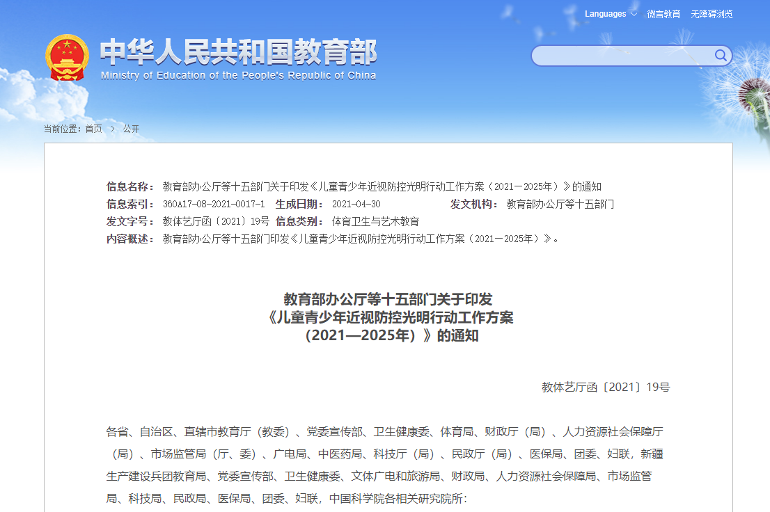今年的6月6日是第26個全國“愛眼日”,據教育部聯合衛生健康委開展的全國兒童青少年近視情況調查結果顯示,2020年全國兒童青少年總體近視率約占50%,我國青少年用眼健康情況不容樂觀。對此,教育部等十五部門聯合印發《兒童青少年近視防控光明行動工作方案(2021—2025年)》(以下簡稱《方案》),聚焦近視防控的關鍵領域、核心要素和關鍵環節,聯合開展專項行動。