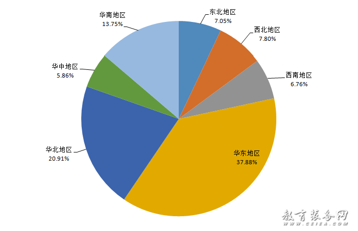 根據(jù)5月份收集到的教育裝備招標采購信息(見圖2、圖3):教育裝備招標采購區(qū)域信息數(shù)據(jù)共3448條(招標采購信息地區(qū)設置為單選項)。其中,華東地區(qū)招標采購信息量1306條,占區(qū)域信息量的37.88%;華北地區(qū)招標采購信息量721條,占區(qū)域信息量的20.91%;華南地區(qū)招標采購信息量474條,占區(qū)域信息量的13.75%;西北地區(qū)招標采購信息量269條,占區(qū)域信息量的7.80%;東北地區(qū)招標采購信息量243條,占區(qū)域信息量的7.05%;西南地區(qū)招標采購信息量233條,占區(qū)域信息量的6.76%;華中地區(qū)教育裝備招標采購信息量均為202條,占區(qū)域信息量的5.86%。