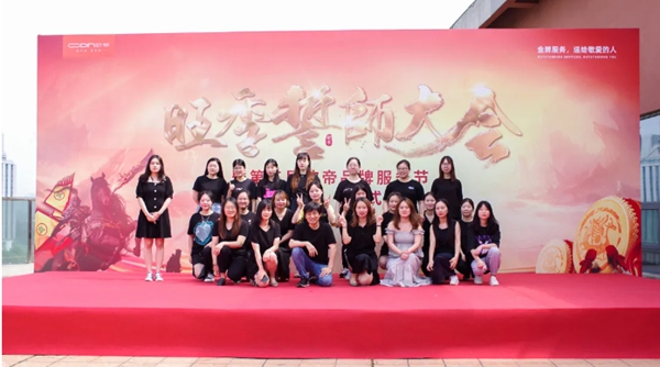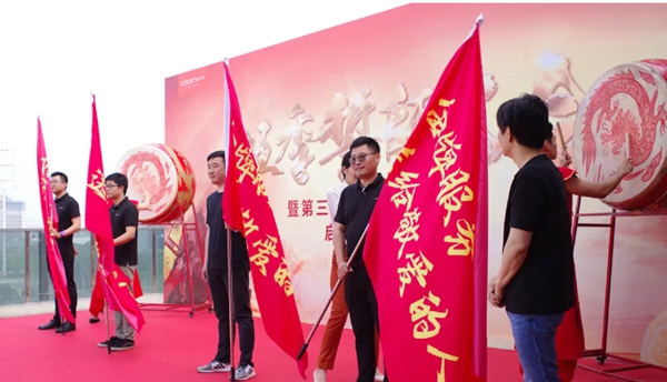 戰鼓聲聲催奮進,旌旗獵獵踏征程。授旗環節,在激昂的戰鼓聲中,歐帝產品、技術、品質、項目服務四大部門負責人接過周總轉交的戰旗,保證完成金牌服務任務。