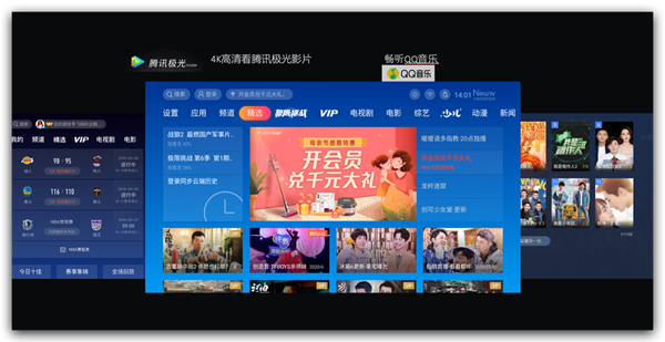 內建安卓9.0智能系統,搭載騰訊極光視頻源,歐洲杯,奧運會,電影大片,電視劇,綜藝,少兒,專題等內容網絡天下。初次語音搜索歌曲 即自動安裝QQ音樂。