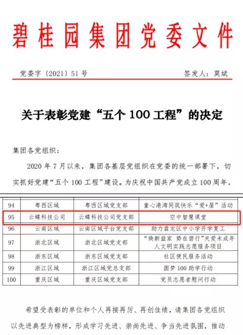 慶祝大會結束后,碧桂園集團黨委書記、總裁莫斌帶領大家重溫了入黨誓詞,并對集團五個100工程進行了頒獎,云蝶科技空中課堂支持“停課不停學”工作獲評“100個惠民實事項目”,受到表彰。最后,莫斌書記囑咐集團全體黨員要認真學習習近平總書記在慶祝大會上的重要講話精神,并且牢記碧桂園董事局主席楊國強經常強調的愛黨愛國家的碧桂園企業文化,真正發揮黨員的先鋒模范作用。