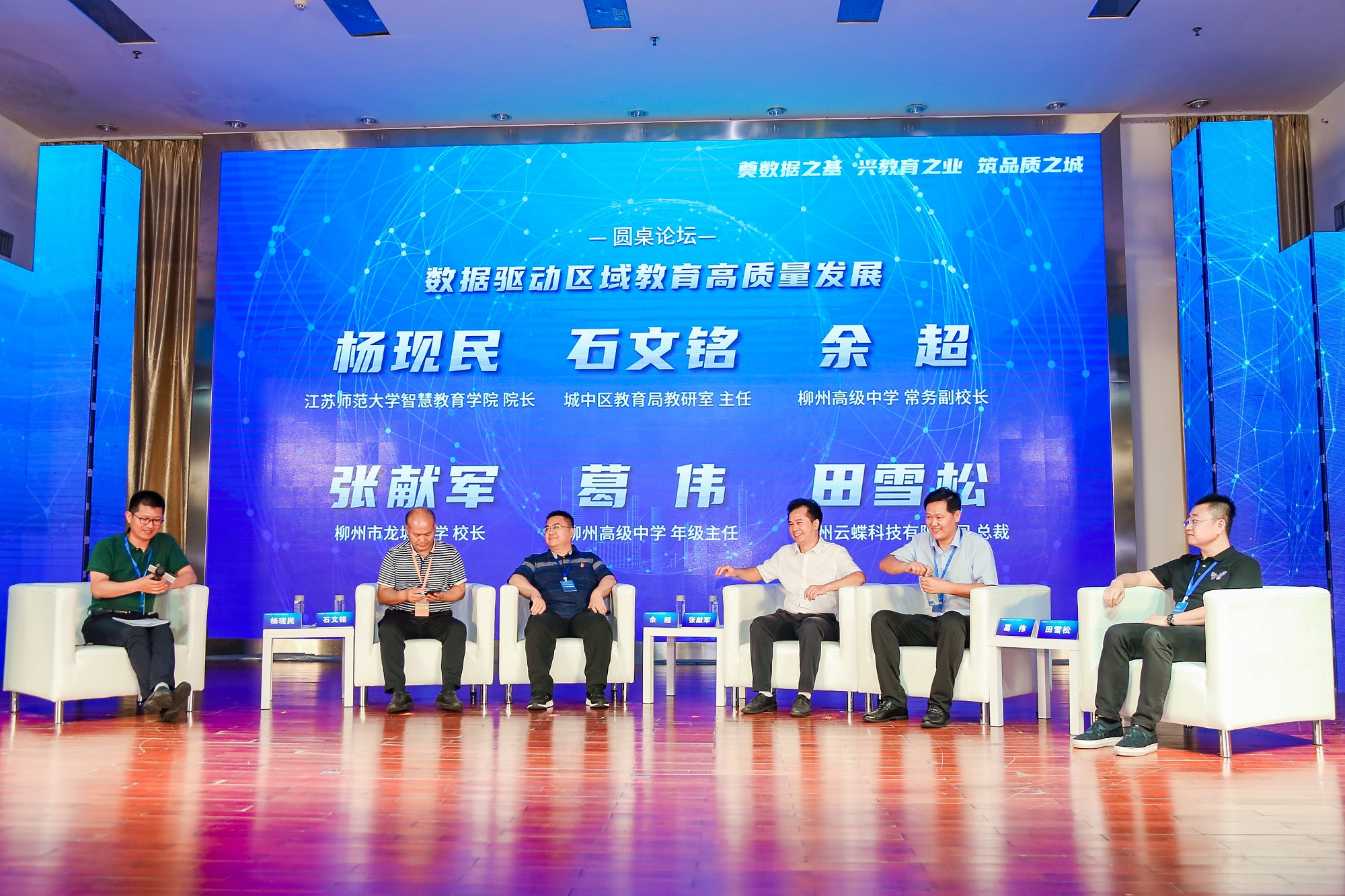 圓桌論壇環(huán)節(jié)由江蘇師范大學(xué)楊現(xiàn)民教授主持,邀請(qǐng)城中區(qū)教育局教研室石文銘主任、柳州高級(jí)中學(xué)余超副校長、城中區(qū)龍城中學(xué)張獻(xiàn)軍校長、柳州高級(jí)中學(xué)葛偉博士、廣州云蝶科技有限公司田雪松總裁,共同圍繞“數(shù)據(jù)驅(qū)動(dòng)區(qū)域教育高質(zhì)量發(fā)展”這一主題進(jìn)行探討。