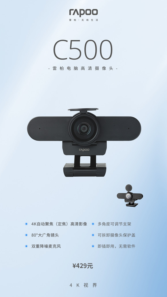 近日,領軍國產外設品牌,實力大廠上市企業Rapoo雷柏,推出了C500電腦高清攝像頭,4K的自動聚焦高清影像,80°的大廣角鏡頭,多角度可調節支架,可拆卸的攝像頭保護蓋,雙重的降噪麥克風等,為你開啟高清直播的互動熱潮。
