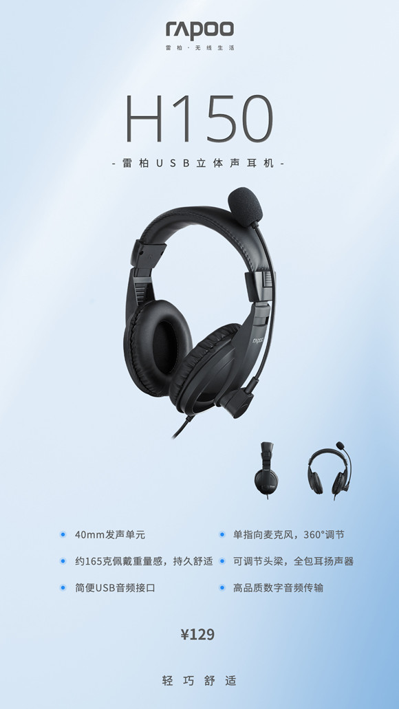 雷柏H150 USB立體聲耳機,擁有40mm數字立體聲發聲單元、標準USB接口、360°可自由調節麥克風、約165克的輕量化佩戴感設計,全包耳式的耳罩設計,十分適合有上網課、話務溝通、視訊聊天需求的用戶使用,官方指導價為129元,產品現已誠意上市。