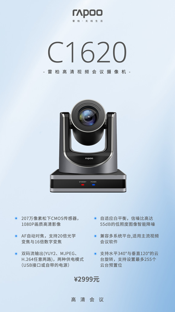 C1620高清視頻會議攝像機作為雷柏首款攝像機的重磅產品,207萬像素松下CMOS傳感器,AF自動對焦的1080P高清影像,支持20倍/16倍 光學/數字變焦,自適應白平衡,高達55DB的信噪比,支持水平340°垂直120°的云臺旋轉,并且支持設置最多255個的云臺預置位,兼容多系統以及多種網絡辦公會議軟件。官方指導價為2999元,產品現已上市。
