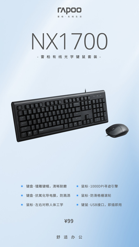 舒適辦公 雷柏NX1700有線光學鍵鼠套裝上市
