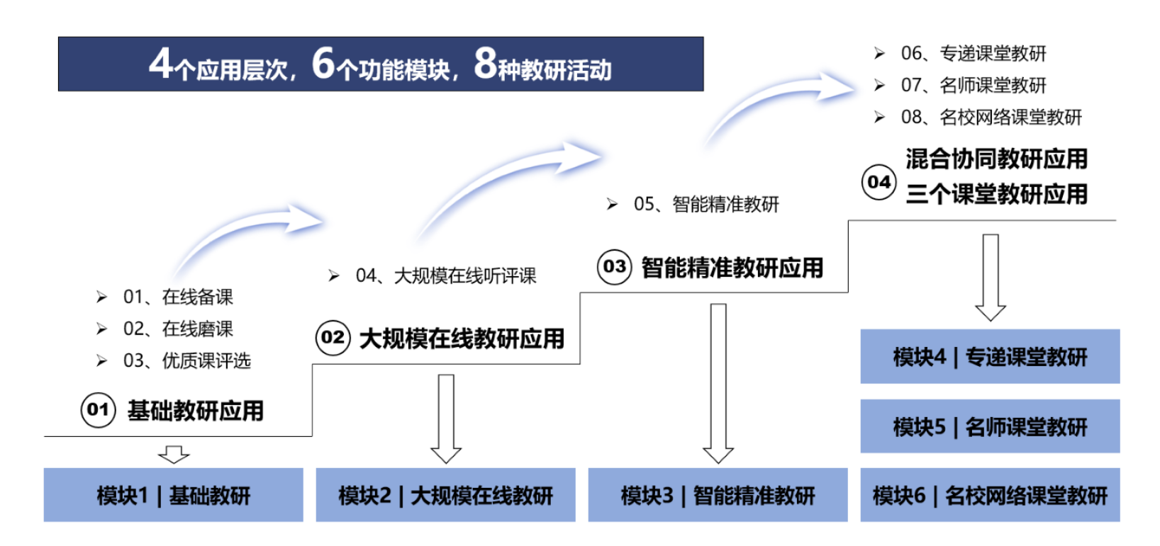 針對(duì)“四階策略”的應(yīng)用,中慶智能研修推出六個(gè)應(yīng)用模塊,即基礎(chǔ)教研、大規(guī)模在線教研、智能精準(zhǔn)教研、專遞課堂教研、名師課堂教研和名校網(wǎng)絡(luò)課堂教研六個(gè)應(yīng)用模塊,以支撐區(qū)域與學(xué)校開展在線備課、在線磨課、優(yōu)質(zhì)課評(píng)選、大規(guī)模聽評(píng)課、智能精準(zhǔn)教研、專遞課堂課堂教研、名師課堂教研、名校網(wǎng)絡(luò)課堂教研等8種不同類型教研活動(dòng)。