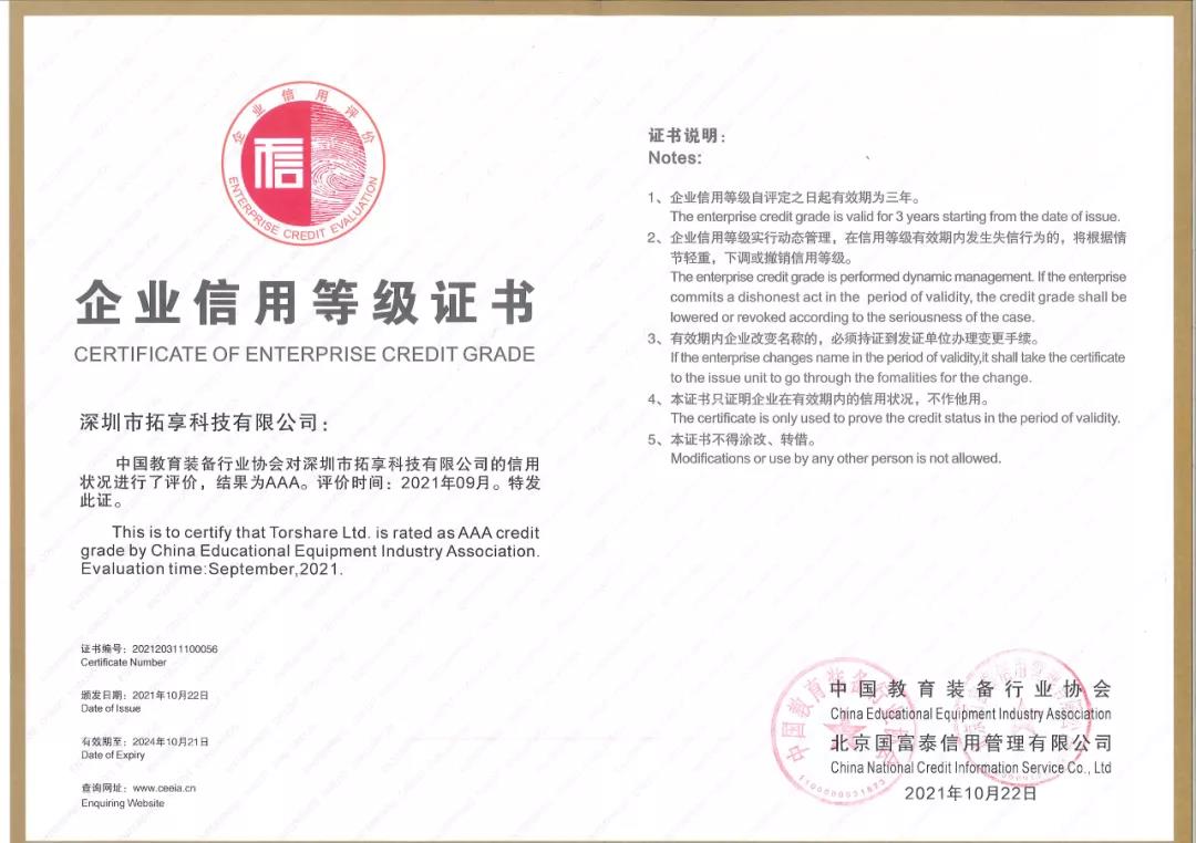今年是拓享科技第一次參與中國教育裝備行業(yè)協(xié)會主辦的信用等級評估,公司嚴格按照相關(guān)程序完成申報、評審工作,憑借真實、全面的評價材料和良好的信用記錄,從全國207家參評企業(yè)中脫穎而出,獲評為最高誠信級別AAA企業(yè)。多年來,拓享科技秉承誠信共贏的理念,堅持誠信經(jīng)營,在項目建設(shè)、產(chǎn)品銷售及售后服務(wù)等方面,堅持做到誠信為本、合作共贏。此次獲評,是對拓享科技不斷提高經(jīng)營風(fēng)險和信用風(fēng)險意識,積極推進企業(yè)誠信建設(shè),加強內(nèi)容制度建設(shè),完善企業(yè)信用管理的肯定,也進一步提升了拓享科技的品牌價值和社會影響力。