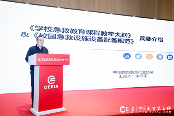 中國教育裝備行業(yè)協(xié)會李守國在會上介紹了《校園急救設(shè)施設(shè)備配備規(guī)范》的編制情況,并代表全國校園急救教育試點工作辦公室正式發(fā)布了《學(xué)校急救教育課程教學(xué)大綱(試行)》。