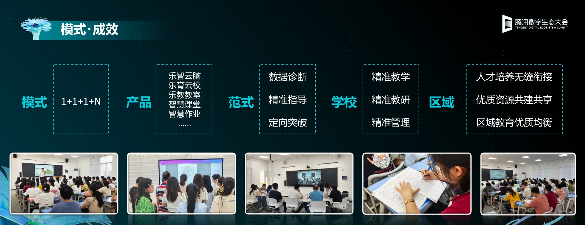 在探索數據驅動教育優質均衡發展的過程中,云蝶科技和騰訊教育聯動合作,發揮各自的技術和資源優勢,探索出數據驅動的五大路徑:數據感知、教研提效、教學提質、管理提升和區域發展。