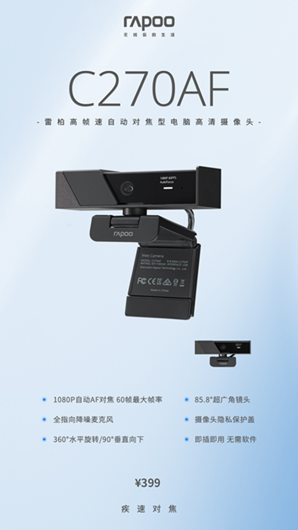 近日,領軍國產外設品牌,實力大廠上市企業Rapoo雷柏,推出了帶有AF自動對焦型的電腦高清攝像頭——C270AF,AF自動對焦1080P畫質的高清影像,60幀的高幀速動態幀率,85.8°超廣角鏡頭,降噪麥克風,攝像頭隱私保護蓋,多角度的旋轉鏡頭等,為你開啟視頻互動的高清流暢直播狂潮。