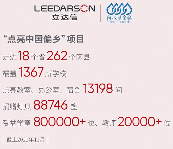 對做燈的人來說,照明是他們的責任。對立達信來說,溫暖人心是企業最誠摯的底色。早在2014年,在集團總裁李江淮先生的指示下,立達信發起了“點亮中國偏鄉”公益項目,旨在幫助經費不足的學校替換老舊照明設施,改善教室光環境,保護學童的視力健康。