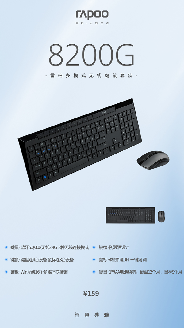 面對繁雜的工作,全心投入的商務人士們最后往往精疲力盡,8200G有著藍牙5.0/3.0/無線2.4G三種智能連接模式,搭配多設備切換。持久續航,輕松應對繁雜工作,鍵盤16個多媒體快捷按鍵搭配巧克力按鍵,敲擊更順暢,回彈更迅速,工作娛樂兩不誤。鼠標4檔可切換的高精度引擎,能在多介質表面適用。正是這些細節上的貼心設計,在幫助提升工作效率的同時,還能帶來悉心舒適的使用體驗。雷柏8200G多模式無線鍵鼠套裝,官方指導價159元,現已上市!