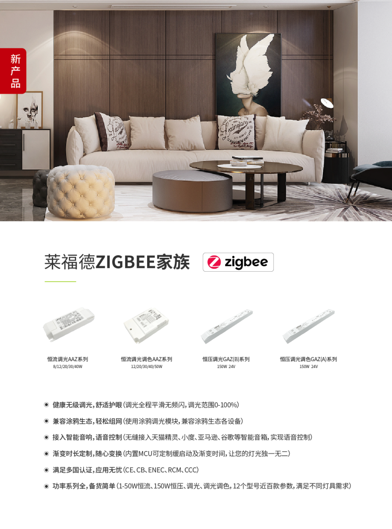 萊福德Zigbee家族除智慧教室專用系列,還有可滿足辦公、商照、家居、燈箱亮化等各領(lǐng)域需求的AAZ調(diào)光系列(8-40W)、ABZ雙色溫系列(12-50W)、GAZ恒壓?jiǎn)握{(diào)光及雙色溫150W系列。