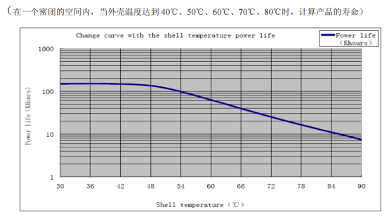 這里,細心的小伙伴可能注意到了小編對于質保有這么一句描述“按照萊福德產品規格書指導,正確應用在產品工作環境內”。為什么要有該要求呢?以某產品壽命曲線舉例,可以看到不同殼溫下產品壽命可相差非常大,故一般電子產品的質保壽命都會對使用環境溫度及產品殼溫做出一定規范。