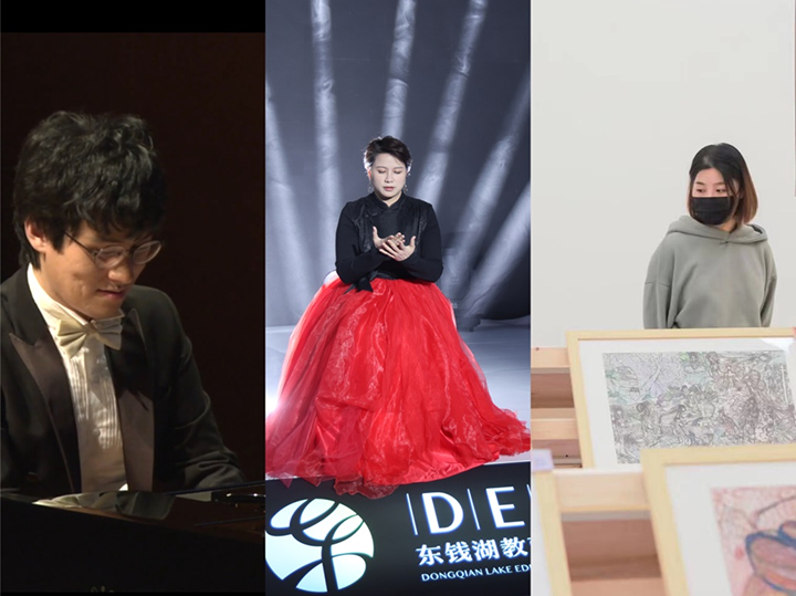 左:《致秋天——王加陽音畫音樂會》,中:手勢舞《心上的羅加》,右:《眾妙之門——走進原生藝術世界》繪畫展覽