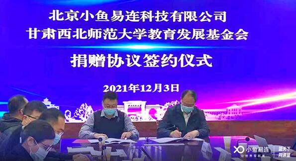 近日,北京小魚易連科技有限公司與西北師范大學教育發展基金會,在西北師范大學順利舉行捐贈協議簽約儀式。小魚易連向西北師范大學教育發展基金會捐贈了價值619萬元的平臺軟件和設備,以公益筑夢教育,用科技賦能未來,攜手西北師范大學,共促教育高質量均衡發展!