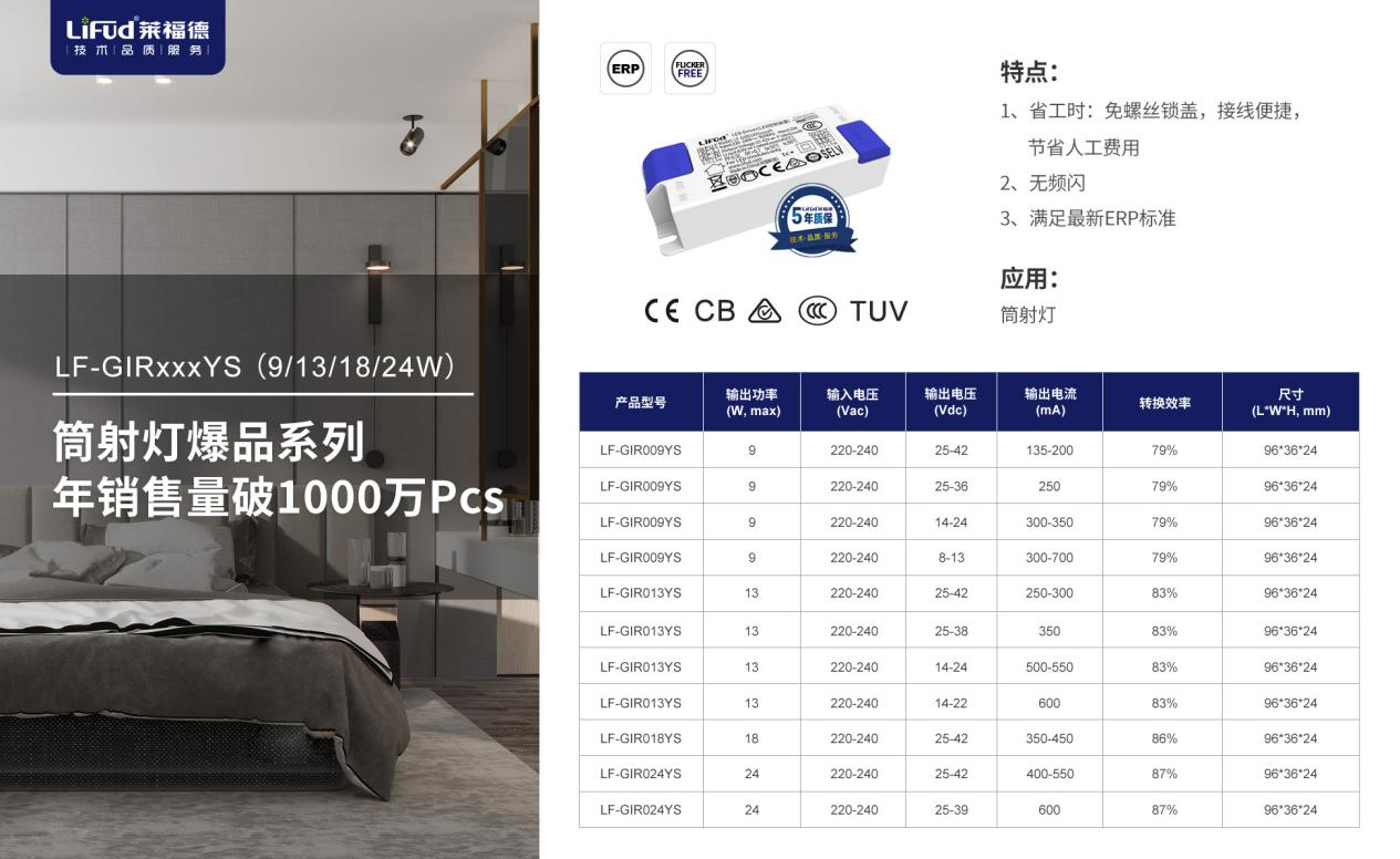 LF-GIRxxxYS系列是萊福德經典爆品,上市至今已出貨破1000萬套。通過一次次升級迭代,在時代的浪潮中穩坐市場筒射燈電源最受歡迎產品寶座。2021再次升級,優化性能滿足最新ERP及諧波標準,細分功率9/13/18/24W四個型號,讓客戶可以精確備貨,減少成本浪費。