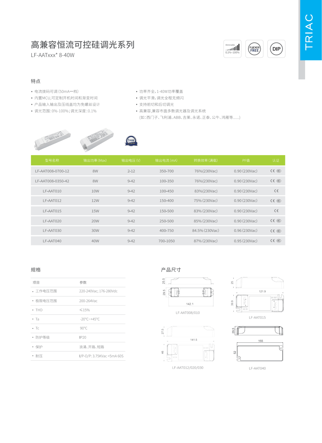 ·AAT恒流調(diào)光電源:兼顧體積、認(rèn)證與性能,內(nèi)置MCU具有超高兼容性,兼容市面主流調(diào)光系統(tǒng),小眾調(diào)光系統(tǒng)也可通過(guò)測(cè)試調(diào)整曲線實(shí)現(xiàn)兼容。