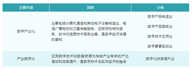 在去年國家統(tǒng)計局公布的《數(shù)字經(jīng)濟(jì)及其核心產(chǎn)業(yè)統(tǒng)計分類(2021)》中,明確了數(shù)字經(jīng)濟(jì)的定義和主要內(nèi)容:數(shù)字經(jīng)濟(jì)是指以數(shù)據(jù)資源作為關(guān)鍵生產(chǎn)要素、以現(xiàn)代信息網(wǎng)絡(luò)作為重要載體、以信息通信技術(shù)的有效使用作為效率提升和經(jīng)濟(jì)結(jié)構(gòu)優(yōu)化的重要推動力的一系列經(jīng)濟(jì)活動,其主要內(nèi)容包含“數(shù)字產(chǎn)業(yè)化”和“產(chǎn)業(yè)數(shù)字化”兩方面。