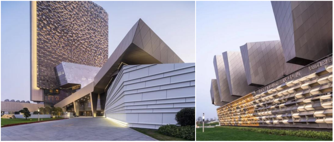 作為新區核心項目,會議中心被冠以“揚子江”之名,設計理念來源大江大河的層波疊浪:起伏的裙樓呼應了長江上的層波疊浪,泛光的鈦板屋頂反射著江面粼粼波光。高聳、開闊的塔樓仿佛江上穿梭的中式帆船,揚帆弄影、乘風 破浪。
