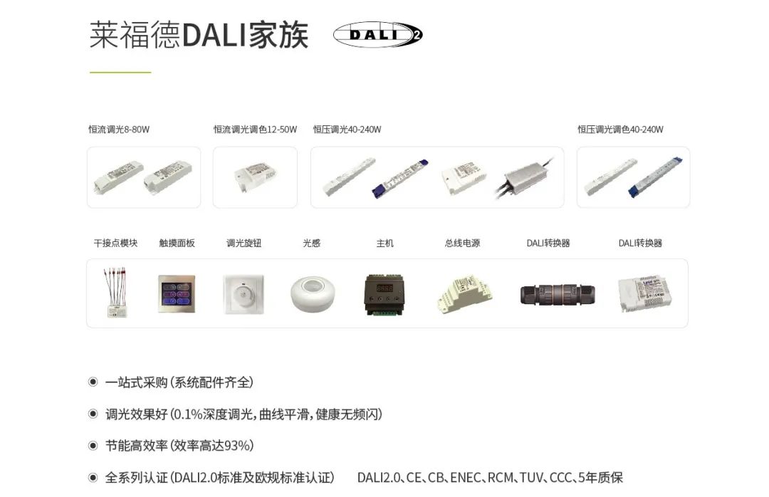 與該項目可持續發展理念相似,萊福德一直秉承“使能源更高效、更清潔”的愿景,15年專注LED電源技術發展,提升產品效率;并通過8年DALI技術研究,實現精準的調光控制與超高的產品轉換效率相結合,可為市場提供完整的DALI調光控制方案。